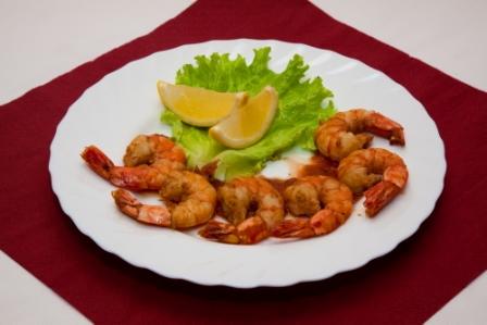 креветки тигровые, салат лист, лимон, соус томатный с чесноком